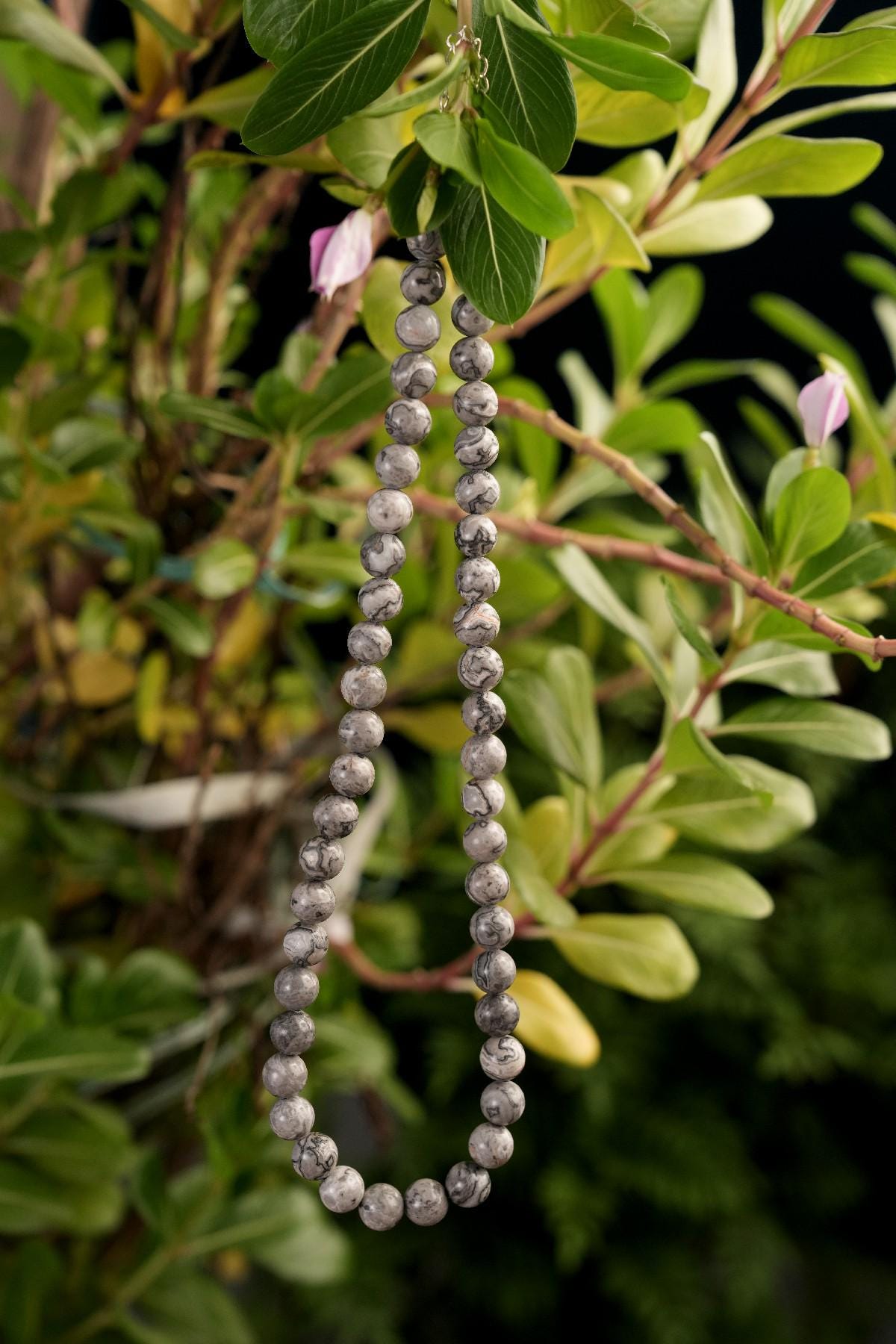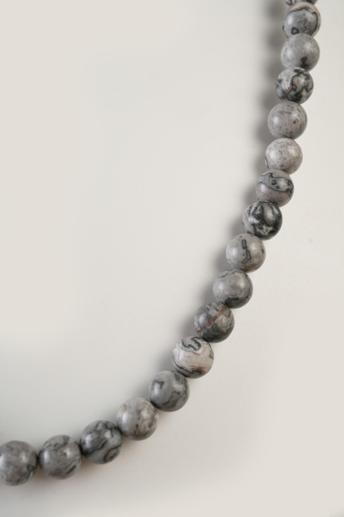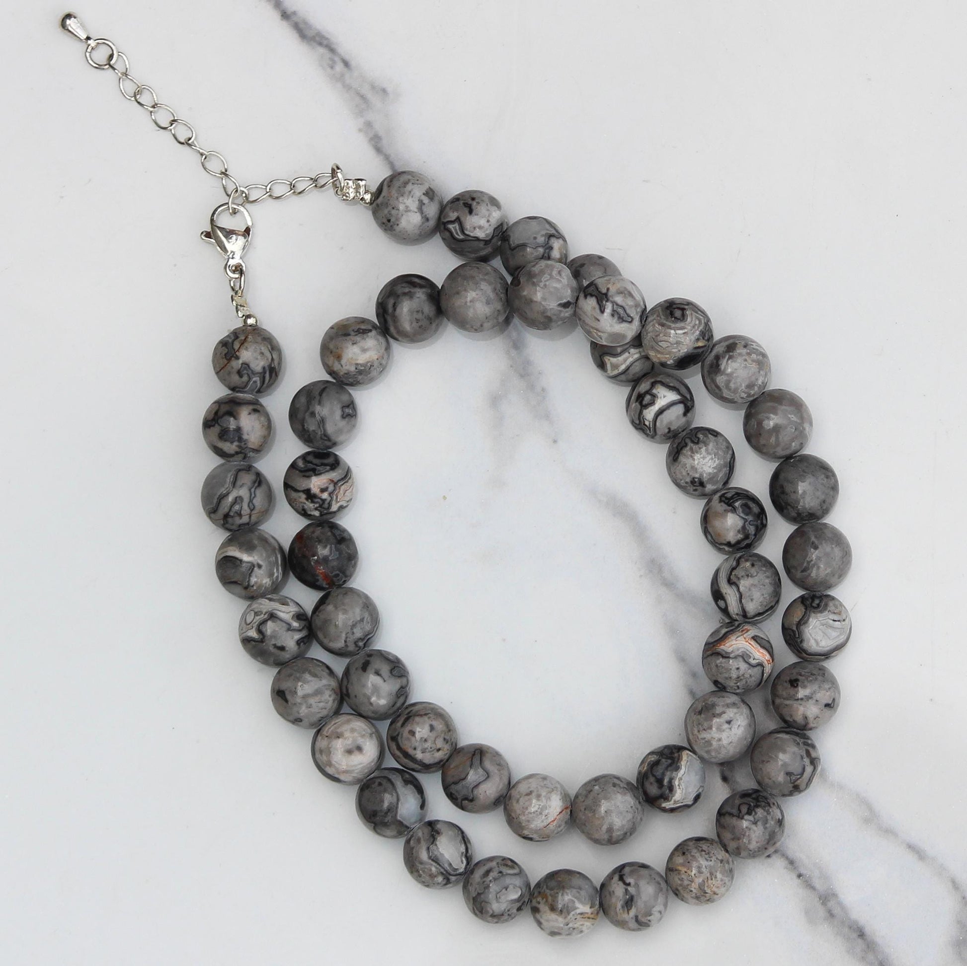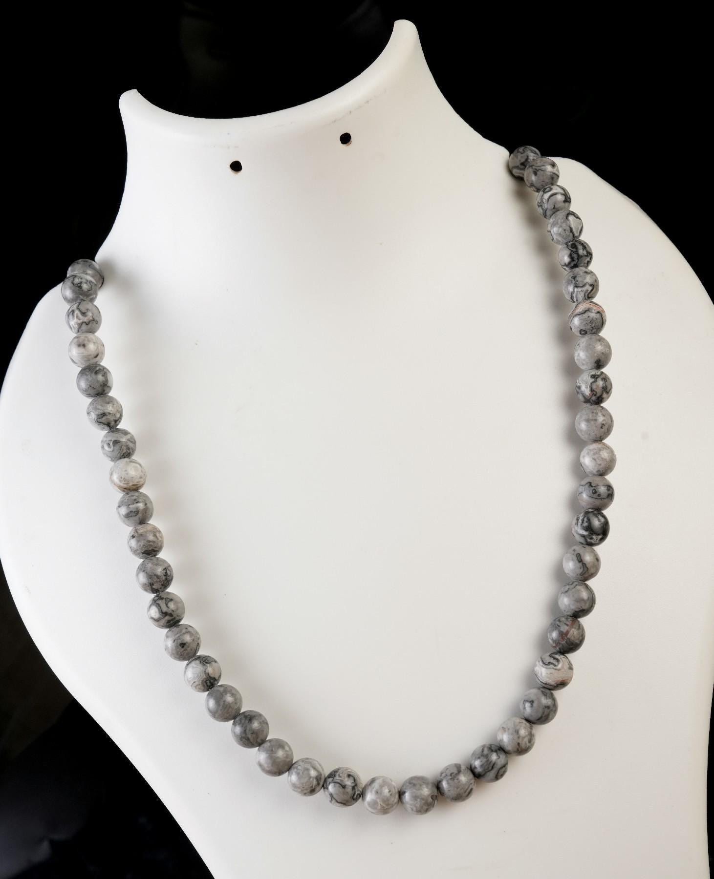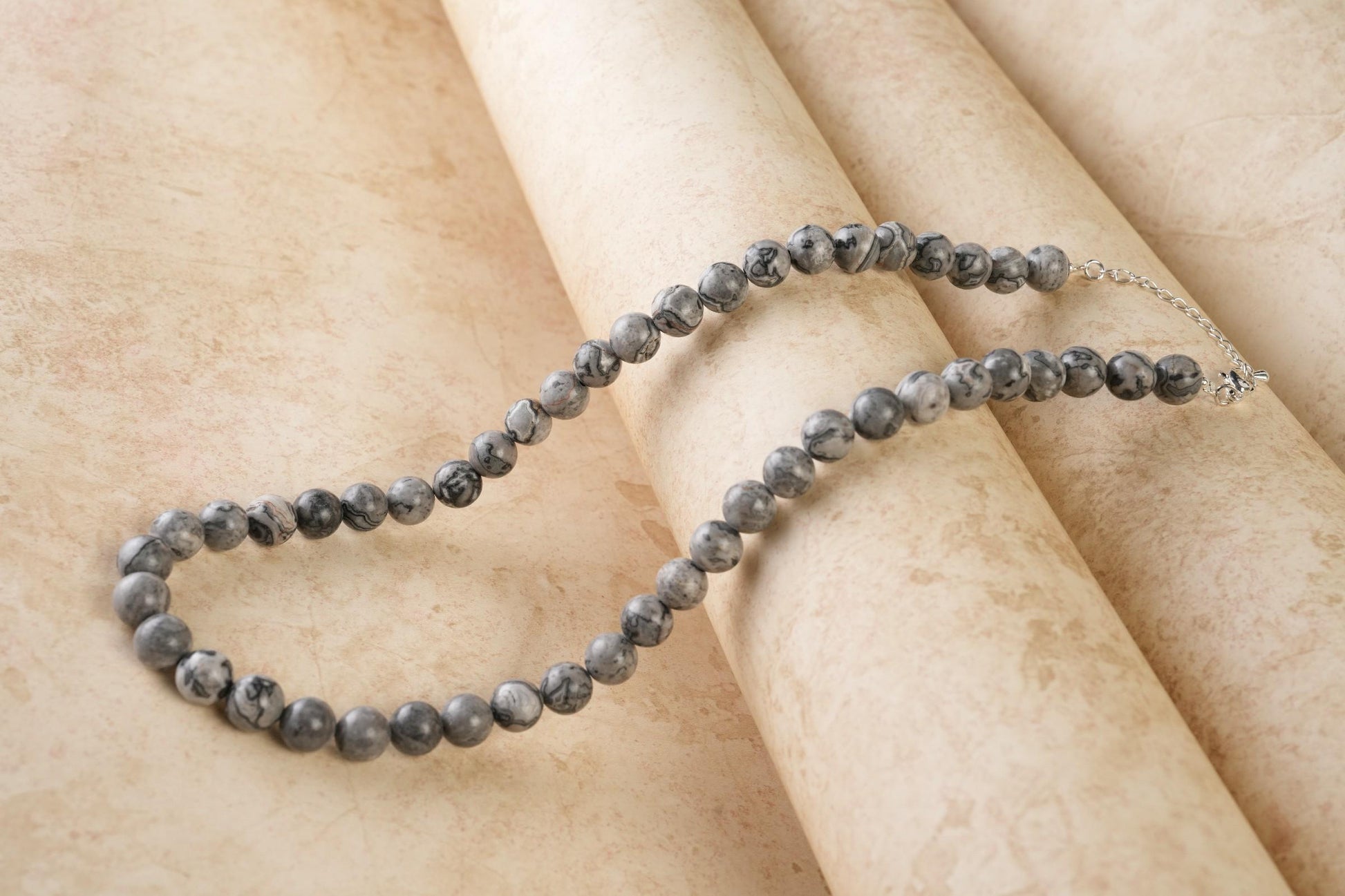 Necklace Length : 16.5 Inches + 2.5 Inches Adjustable Chain- **Premium Quality**: Crafted from genuine Grey Map Jasper, this necklace promises exceptional quality and durability, ensuring it remains a cherished piece in your jewelry collection for years to come.- **Mindful Elegance**: Each 8 MM round smooth bead is meticulously handcrafted, offering a unique touch that enhances your personal style while promoting mindfulness and tranquility. Wear it as a reminder to stay grounded in your daily life.- **Adjustable Comfort**: Designed with versatility in mind, the adjustable feature allows you to customize the length of the necklace effortlessly. Whether you prefer a choker or longer drop style, this piece adapts beautifully to any outfit or occasion.- **Artisan Craftsmanship**: Celebrate the beauty of handmade artistry! The intricate detailing and natural variations of each bead make every necklace one-of-a-kind—just like you. Stand out with a piece that tells its own story.- **Versatile Accessory**: Perfect for layering or wearing solo, this mala necklace transitions seamlessly from casual daywear to elegant evening attire. Elevate any look while enjoying the calming energy of natural stones.- **Thoughtful Gift Choice**: Looking for a meaningful gift? This handcrafted mala necklace is an ideal present for birthdays, anniversaries, or just because! Share love and positive vibes with someone special in your life.Embrace the elegance and serenity that comes with wearing our Genuine Grey Map Jasper Beads Necklace—a perfect blend of style and mindfulness awaits you!