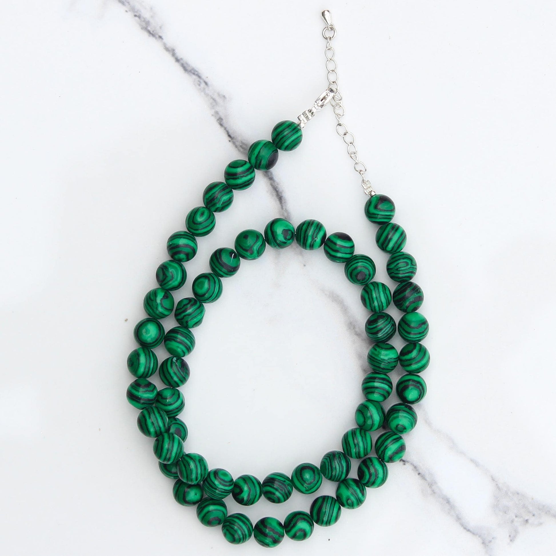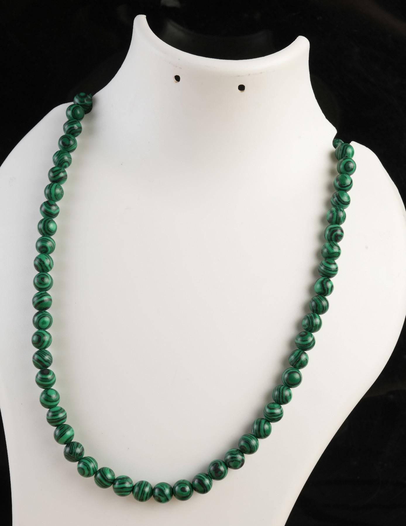 Necklace Length : 16.5 Inches + 2.5 Inches Adjustable Chain- **Premium Quality**: Crafted from genuine malachite, this necklace showcases the rich, vibrant hues of nature. Each bead is meticulously selected to ensure exceptional quality and durability, making it a timeless addition to your jewelry collection.- **Spiritual Connection**: Embrace the healing properties of malachite! Known for its ability to promote emotional balance and transformation, wearing this necklace can enhance your meditation practice or daily mindfulness rituals.- **Adjustable Design**: Featuring an adjustable length, this handcrafted mala necklace allows you to customize the fit for ultimate comfort. Whether layered with other pieces or worn solo, it adapts effortlessly to your unique style.- **Elegant Aesthetics**: The 8 MM round smooth beads exude sophistication and elegance. Their polished finish catches the light beautifully, making this necklace a stunning accessory for any occasion—be it casual outings or formal events.- **Thoughtful Gift Choice**: Looking for a meaningful gift? This mala necklace is perfect for birthdays, anniversaries, or just because! Its unique design and spiritual significance make it a heartfelt present that will be cherished by her forever.Elevate your style and spirit with our Genuine Malachite Beads Necklace—a piece that not only adorns but also inspires!