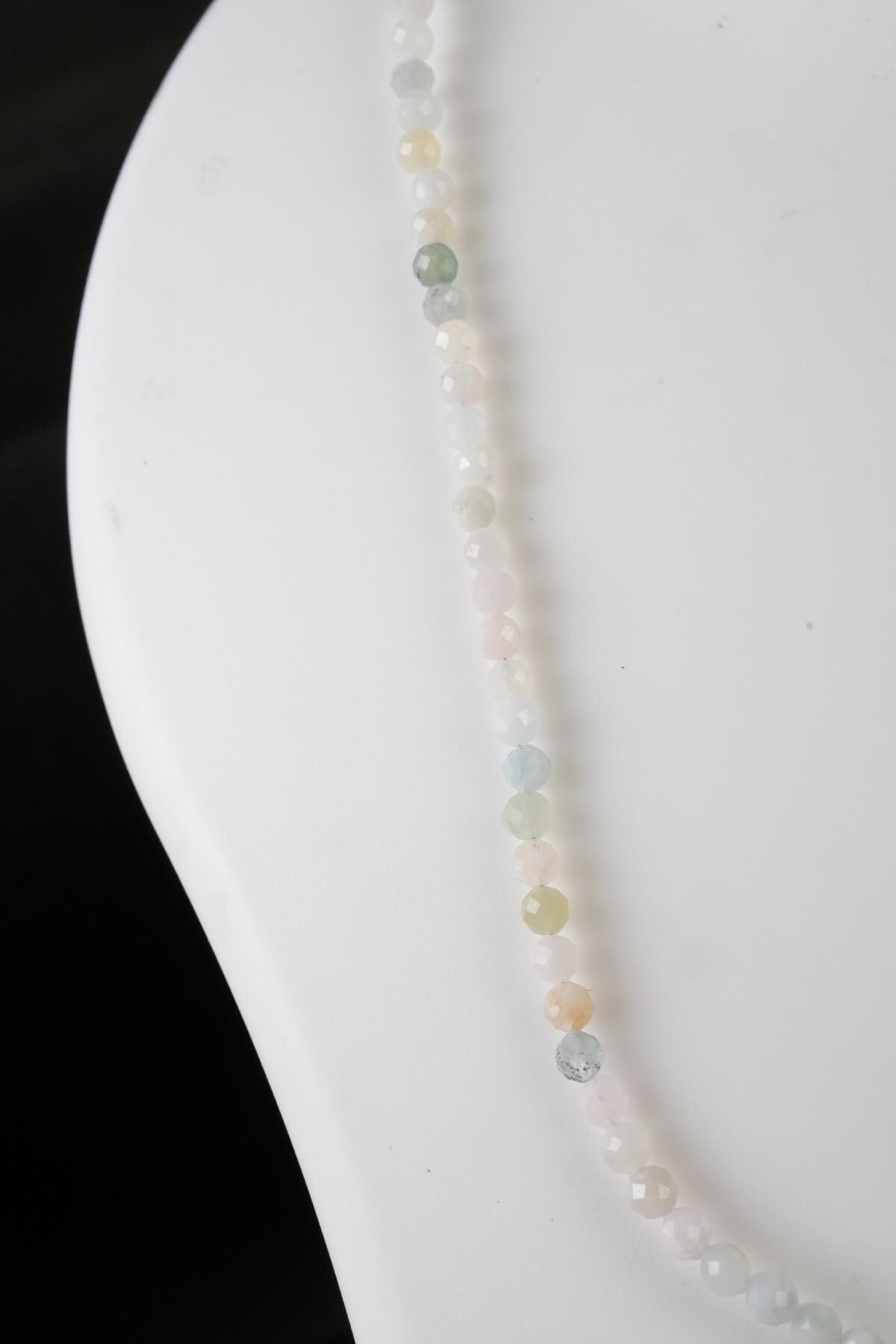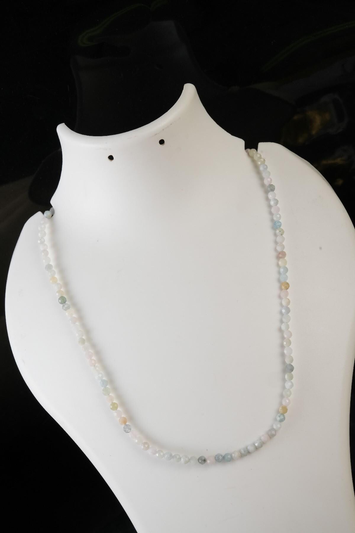 Necklace Length : 16.5 Inches + 2.5 Inches Adjustable Chain- **Premium Quality:** Crafted from genuine Morganite, this necklace offers a luxurious touch that is both elegant and durable. Each bead is meticulously selected to ensure you receive only the finest quality jewelry.- **Versatile Design:** The handcrafted adjustable mala design allows for effortless styling. Whether you're dressing up for a special occasion or adding a touch of elegance to your everyday look, this necklace adapts beautifully to any outfit.- **Micro Faceted Brilliance:** Featuring 3 MM round micro faceted beads, this necklace sparkles with every movement. The intricate facets catch the light, creating an enchanting shimmer that draws attention and compliments wherever you go.- **Mindful Connection:** Embrace the spiritual significance of mala necklaces! This piece not only serves as stunning jewelry but also aids in meditation and mindfulness practices, helping you find peace and balance in your daily life.- **Unique Selling Point:** Each necklace is one-of-a-kind due to the natural variations in Morganite stones. This means you're wearing a truly unique piece that reflects your individuality—no two necklaces are alike!Elevate your accessory game with this exquisite Genuine Morganite Beads Necklace—where beauty meets purpose!