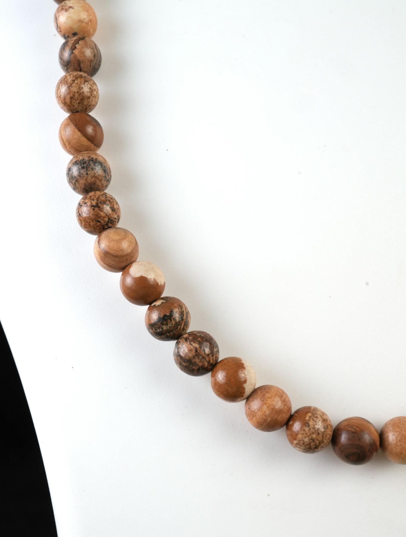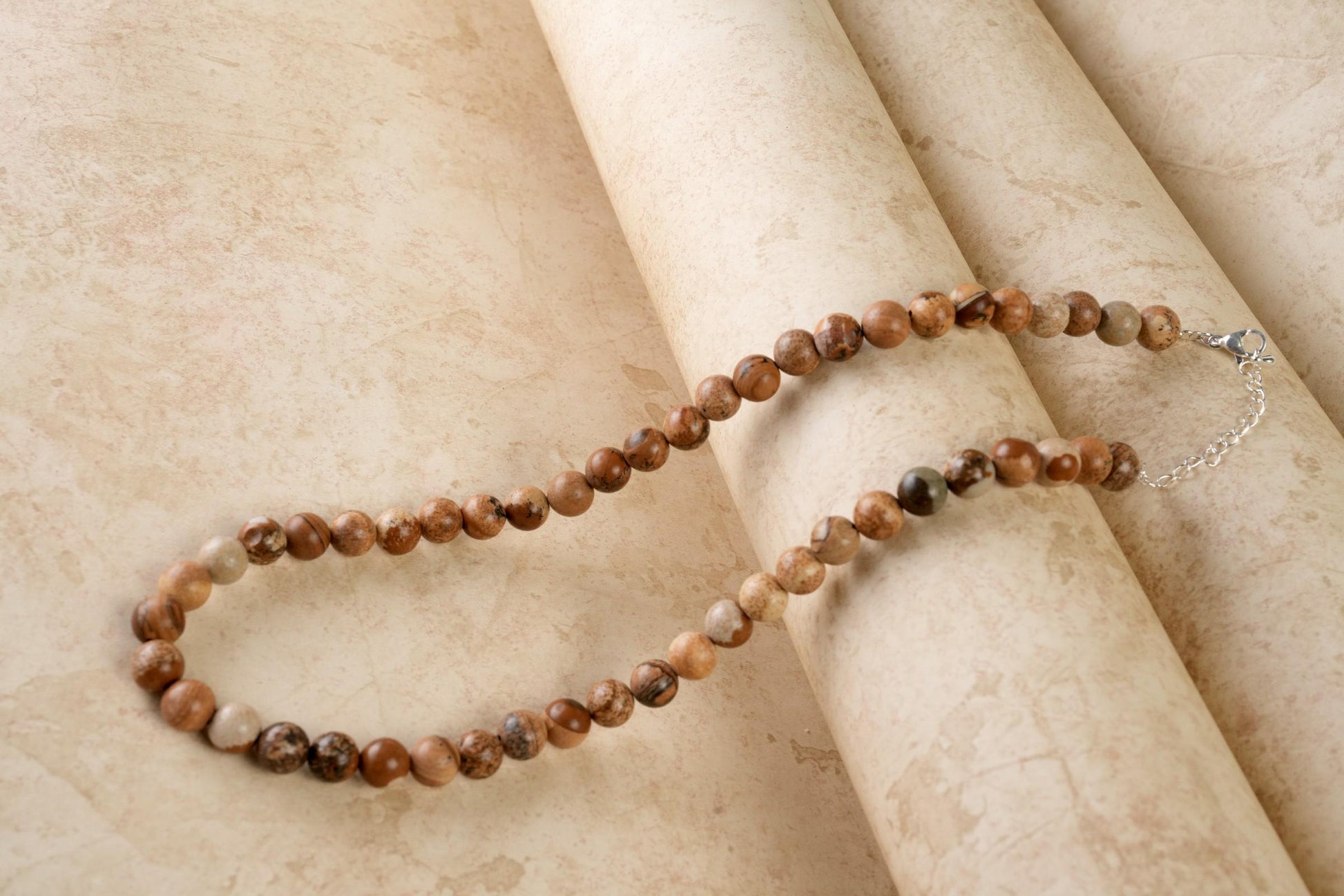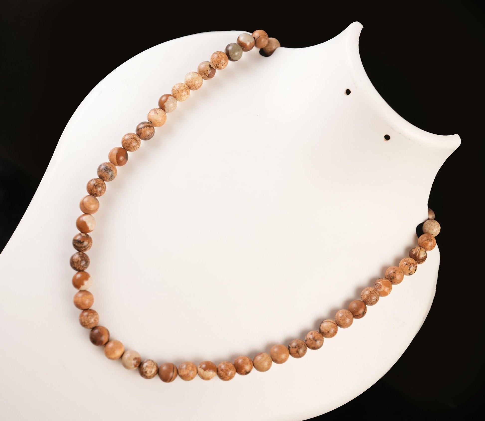 Necklace Length : 16.5 Inches + 2.5 Inches Adjustable Chain- **Premium Quality**: Crafted from genuine Picture Jasper, this necklace boasts top-tier materials that ensure durability and a timeless aesthetic. Each bead is a unique piece of art, reflecting nature's beauty.- **Mindful Design**: The 8 MM round smooth beads not only create a visually stunning accessory but also serve as a powerful mala necklace. Perfect for meditation or mindfulness practices, it helps center your thoughts and enhance your spiritual journey.- **Adjustable Comfort**: Featuring an adjustable design, this mala necklace offers versatility to suit any style or occasion. Whether you prefer it long or short, you can easily customize the fit to complement your outfit perfectly.- **Artisan Craftsmanship**: Handcrafted with love and attention to detail, each necklace showcases exquisite craftsmanship. This isn't just jewelry; it's a statement piece that tells a story of dedication and artistry.- **Unique Connection**: Embrace the grounding energy of Picture Jasper—a stone known for its calming properties. Wearing this necklace not only elevates your style but also connects you with nature’s tranquility, making it an ideal gift for yourself or someone special in your life.Elevate your accessory game with this handcrafted mala necklace—where elegance meets purpose!