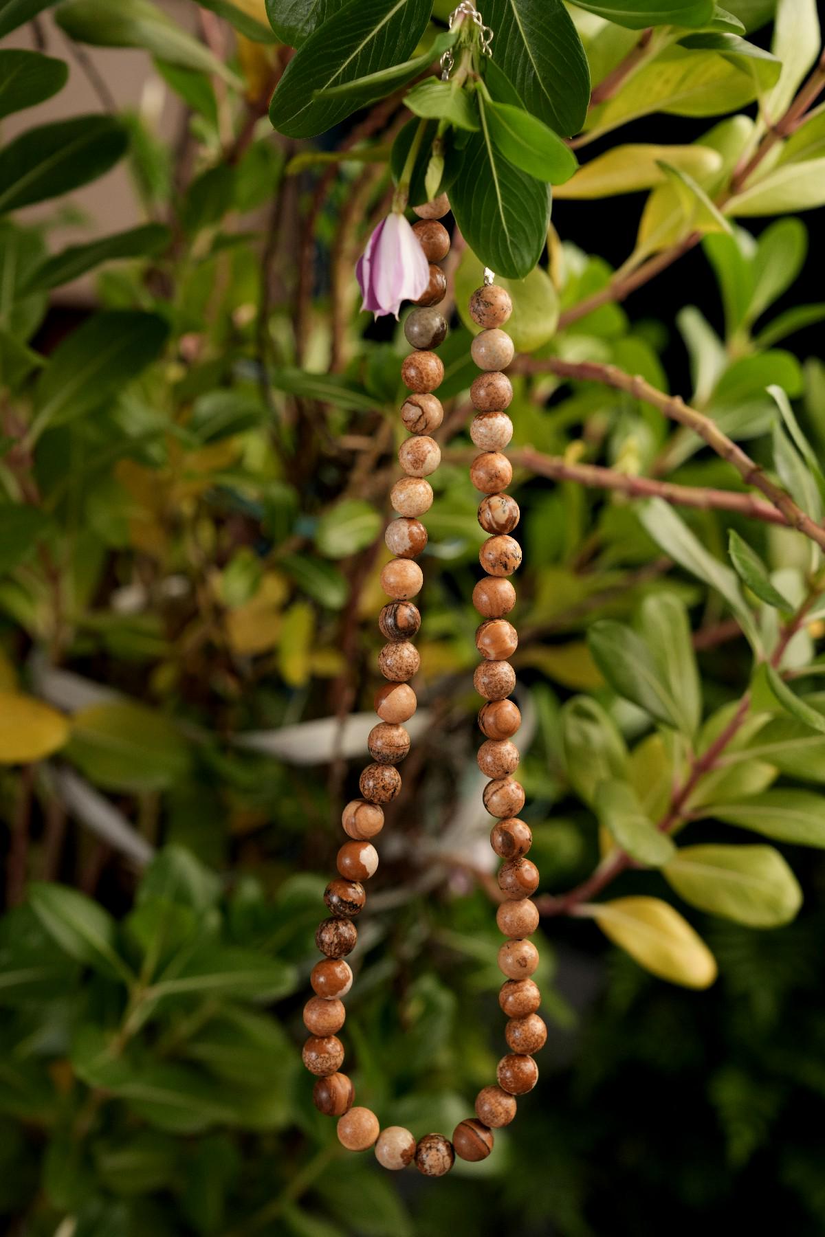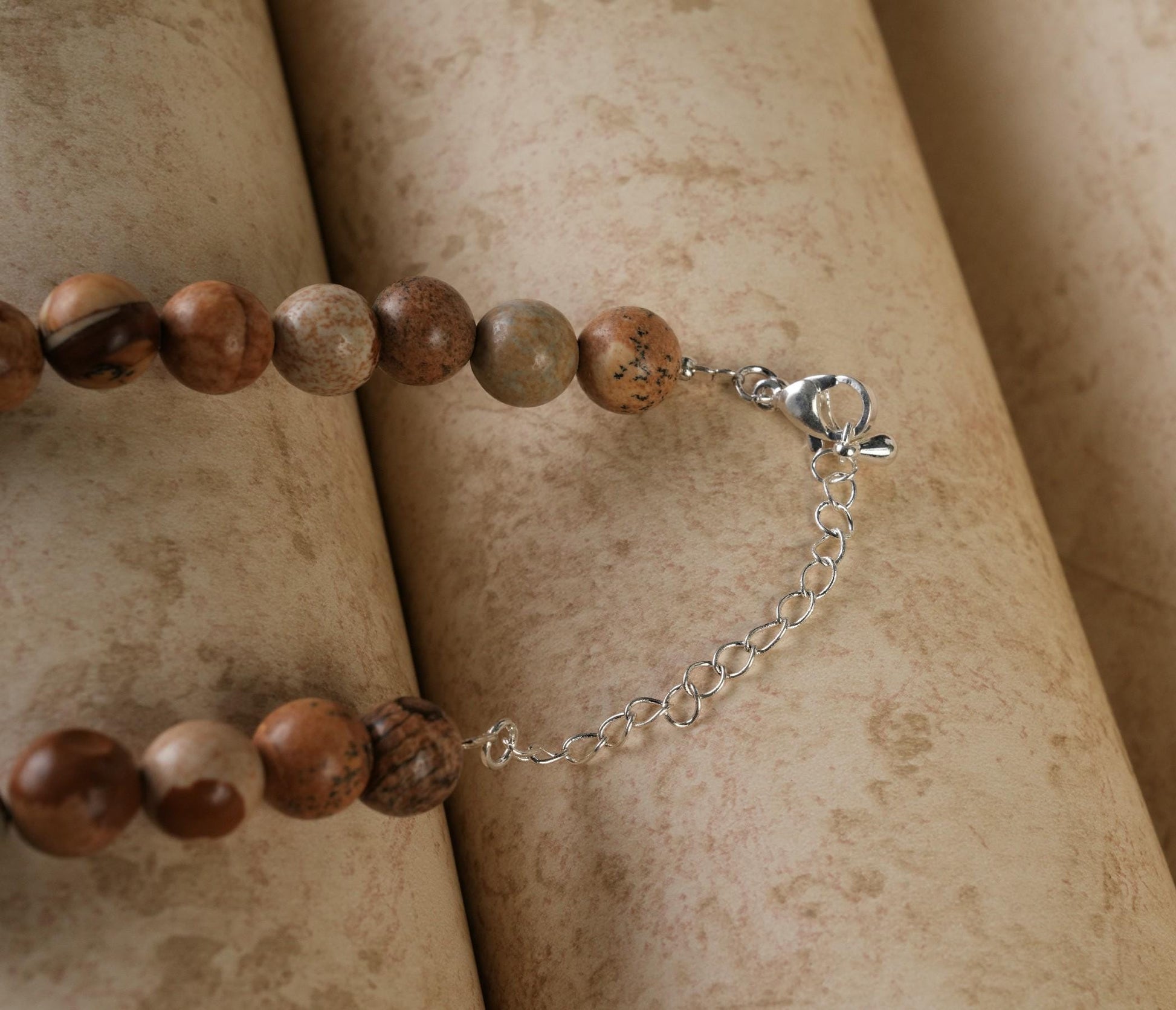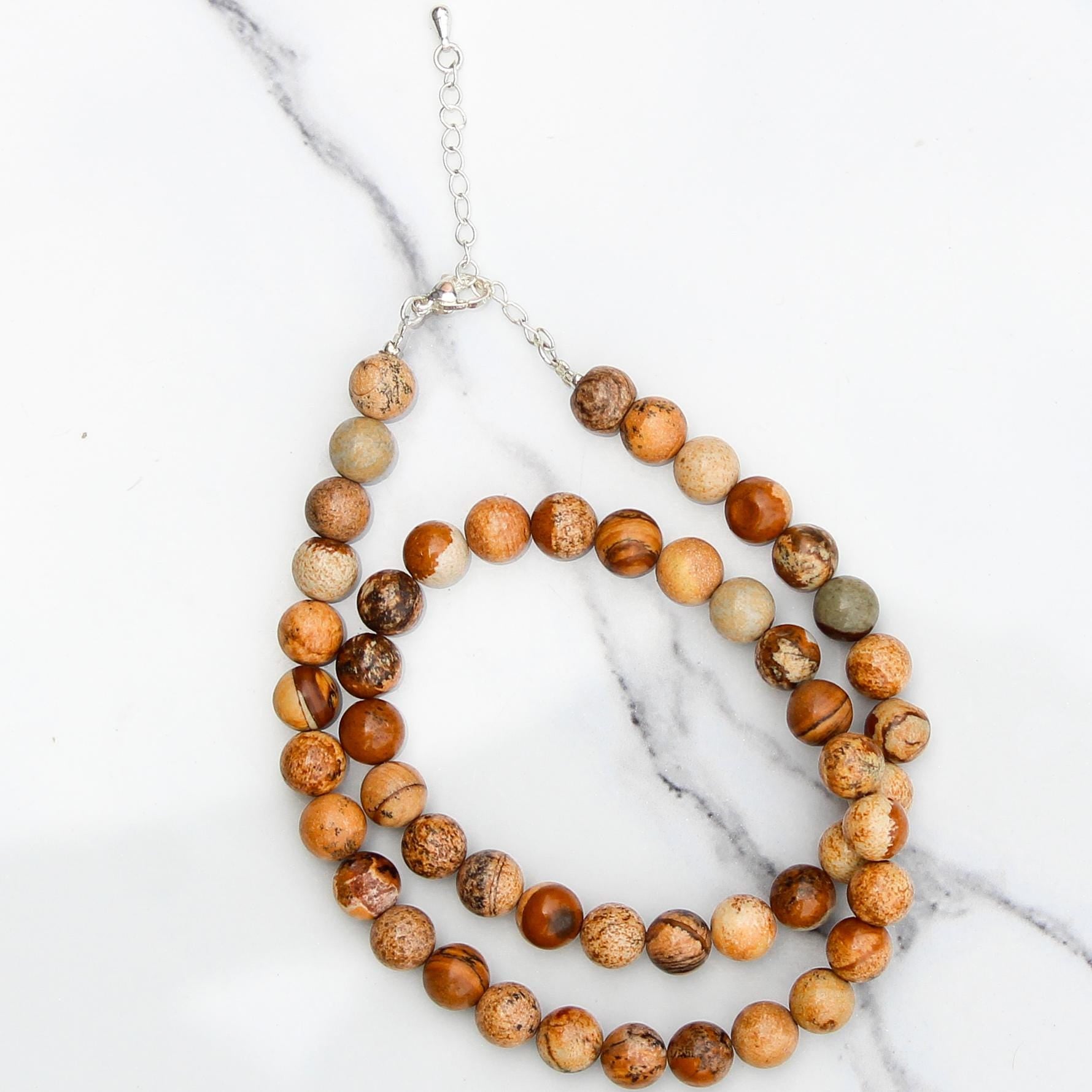 Necklace Length : 16.5 Inches + 2.5 Inches Adjustable Chain- **Premium Quality**: Crafted from genuine Picture Jasper, this necklace boasts top-tier materials that ensure durability and a timeless aesthetic. Each bead is a unique piece of art, reflecting nature's beauty.- **Mindful Design**: The 8 MM round smooth beads not only create a visually stunning accessory but also serve as a powerful mala necklace. Perfect for meditation or mindfulness practices, it helps center your thoughts and enhance your spiritual journey.- **Adjustable Comfort**: Featuring an adjustable design, this mala necklace offers versatility to suit any style or occasion. Whether you prefer it long or short, you can easily customize the fit to complement your outfit perfectly.- **Artisan Craftsmanship**: Handcrafted with love and attention to detail, each necklace showcases exquisite craftsmanship. This isn't just jewelry; it's a statement piece that tells a story of dedication and artistry.- **Unique Connection**: Embrace the grounding energy of Picture Jasper—a stone known for its calming properties. Wearing this necklace not only elevates your style but also connects you with nature’s tranquility, making it an ideal gift for yourself or someone special in your life.Elevate your accessory game with this handcrafted mala necklace—where elegance meets purpose!