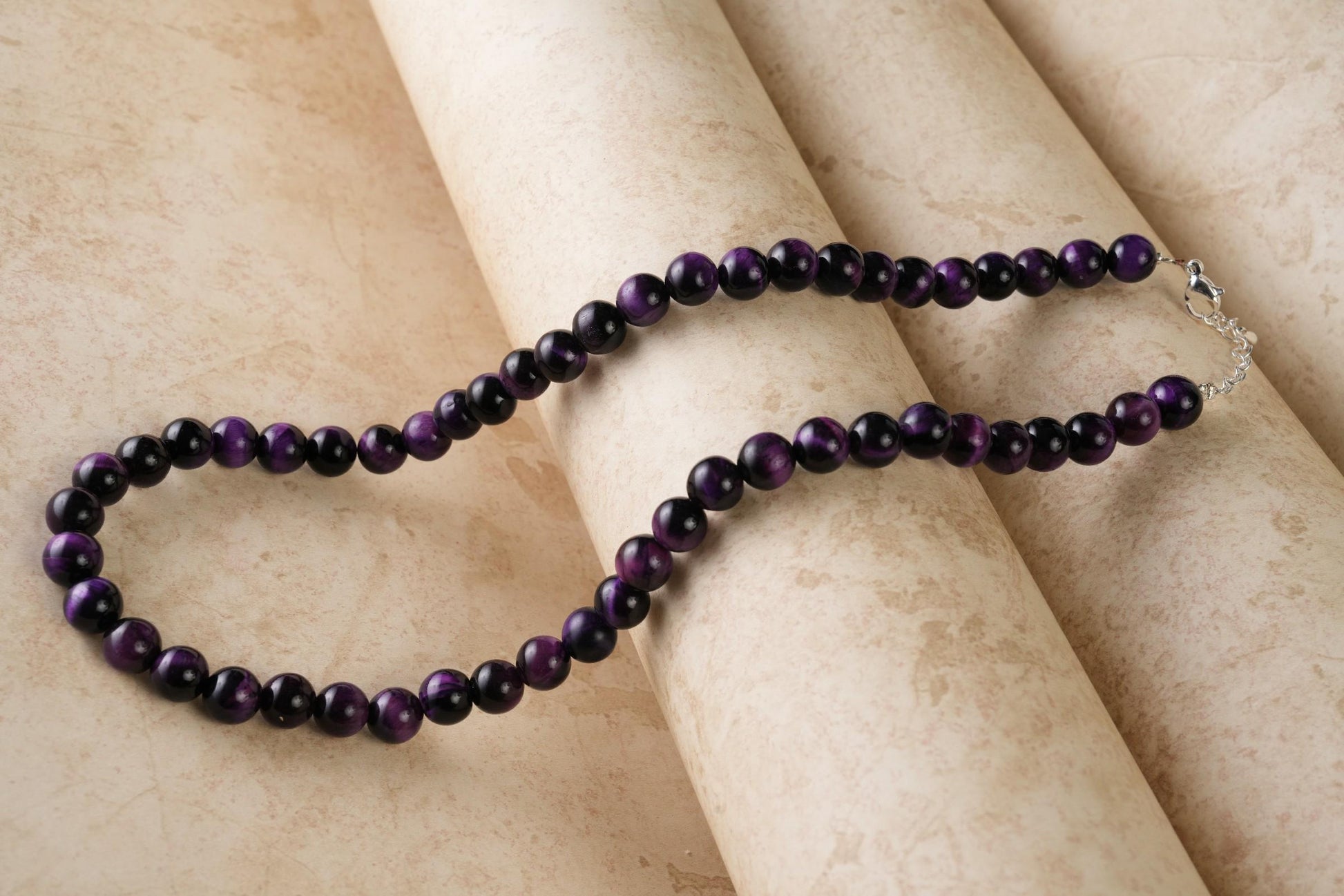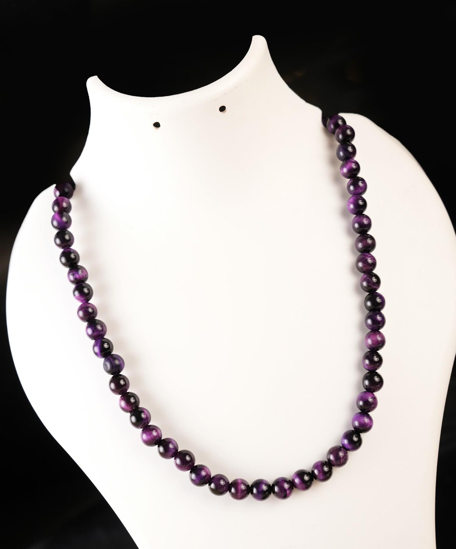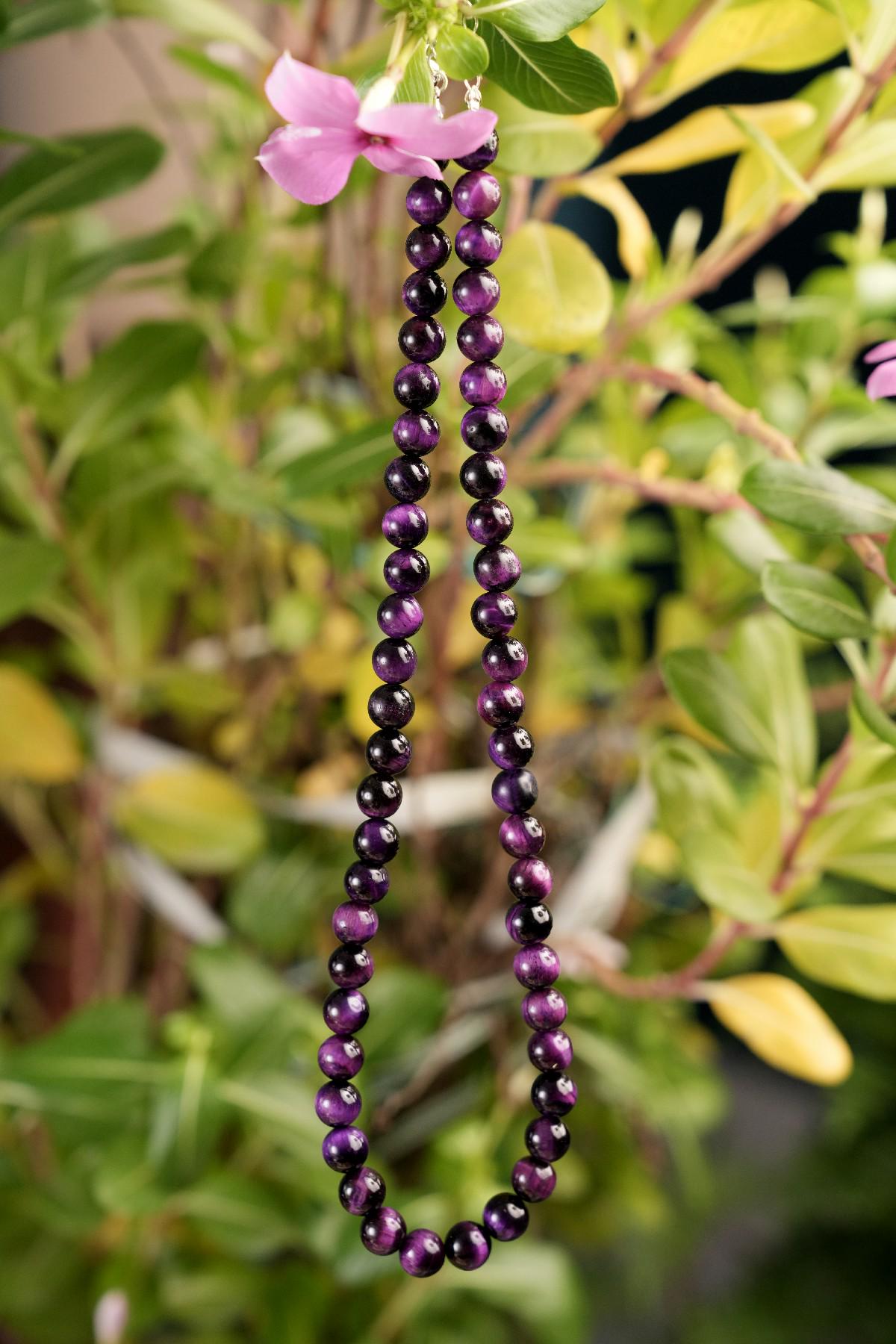 Necklace Length : 16.5 Inches + 2.5 Inches Adjustable Chain- **Premium Quality:** Crafted from genuine purple tiger's eye, this necklace boasts unparalleled quality and durability, ensuring it remains a cherished piece in your jewelry collection for years to come.- **Healing Properties:** Embrace the calming energy of purple tiger's eye, known for its grounding and protective qualities. This necklace not only enhances your style but also promotes emotional balance and clarity in daily life.- **Handcrafted Elegance:** Each bead is meticulously handcrafted, featuring 8 MM round smooth beads that radiate sophistication. The artisanal touch ensures that no two necklaces are alike, making yours truly one-of-a-kind.- **Adjustable Comfort:** Designed with an adjustable feature, this mala necklace allows you to customize the fit for maximum comfort. Whether you prefer a snug or loose fit, it's perfect for any occasion—dress it up or wear it casually!- **Versatile Style Statement:** Effortlessly transition from day to night with this stunning accessory. Pair it with a simple tee or an elegant dress; its rich purple hues add a pop of color while complementing any outfit beautifully.- **Thoughtful Gift Idea:** Looking for the perfect gift? This handcrafted mala necklace makes an ideal present for birthdays, anniversaries, or just because! Share the beauty and benefits of genuine gemstones with someone special in your life.Elevate your jewelry game and embrace the unique charm of our Genuine Purple Tiger's Eye Beads Necklace today!