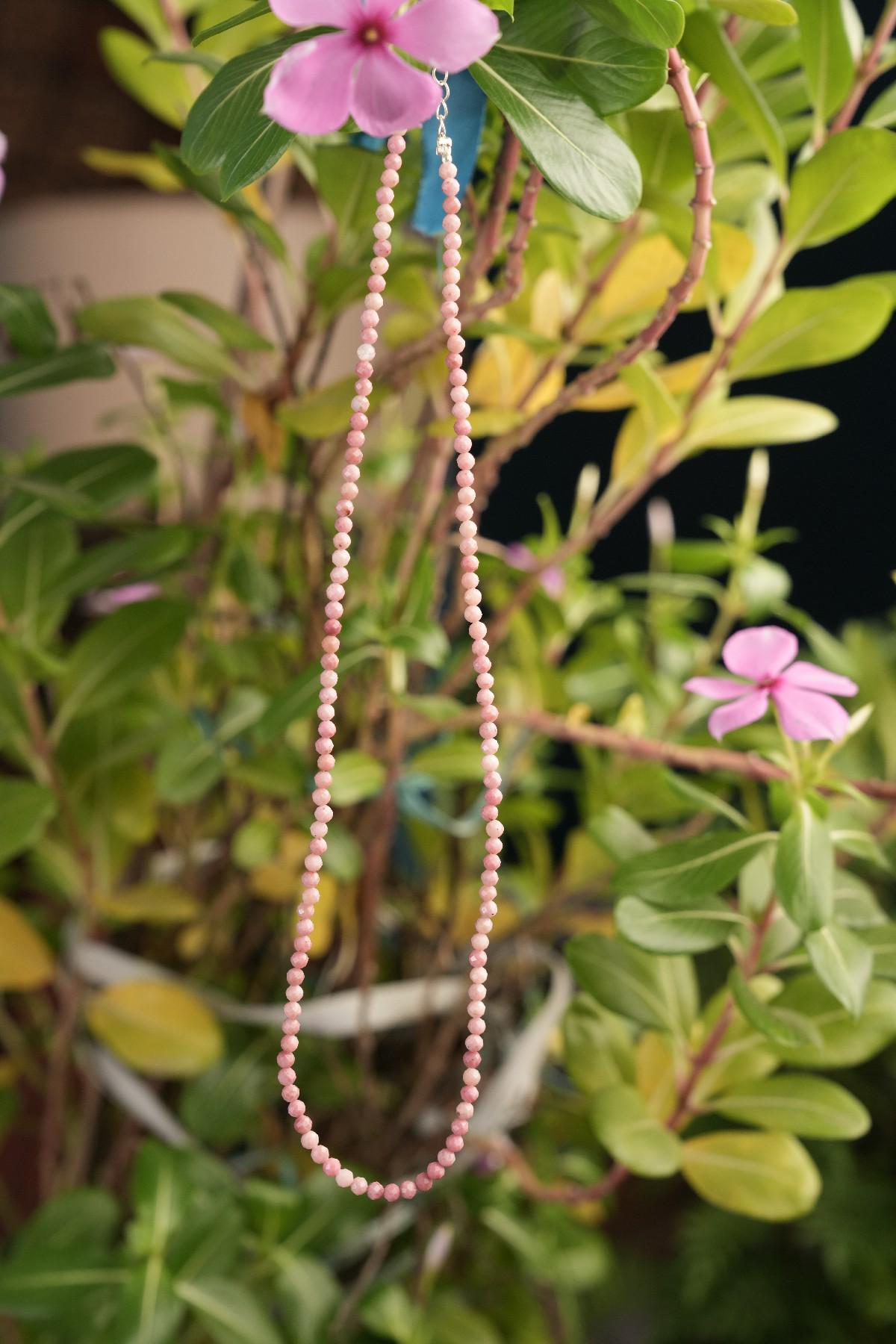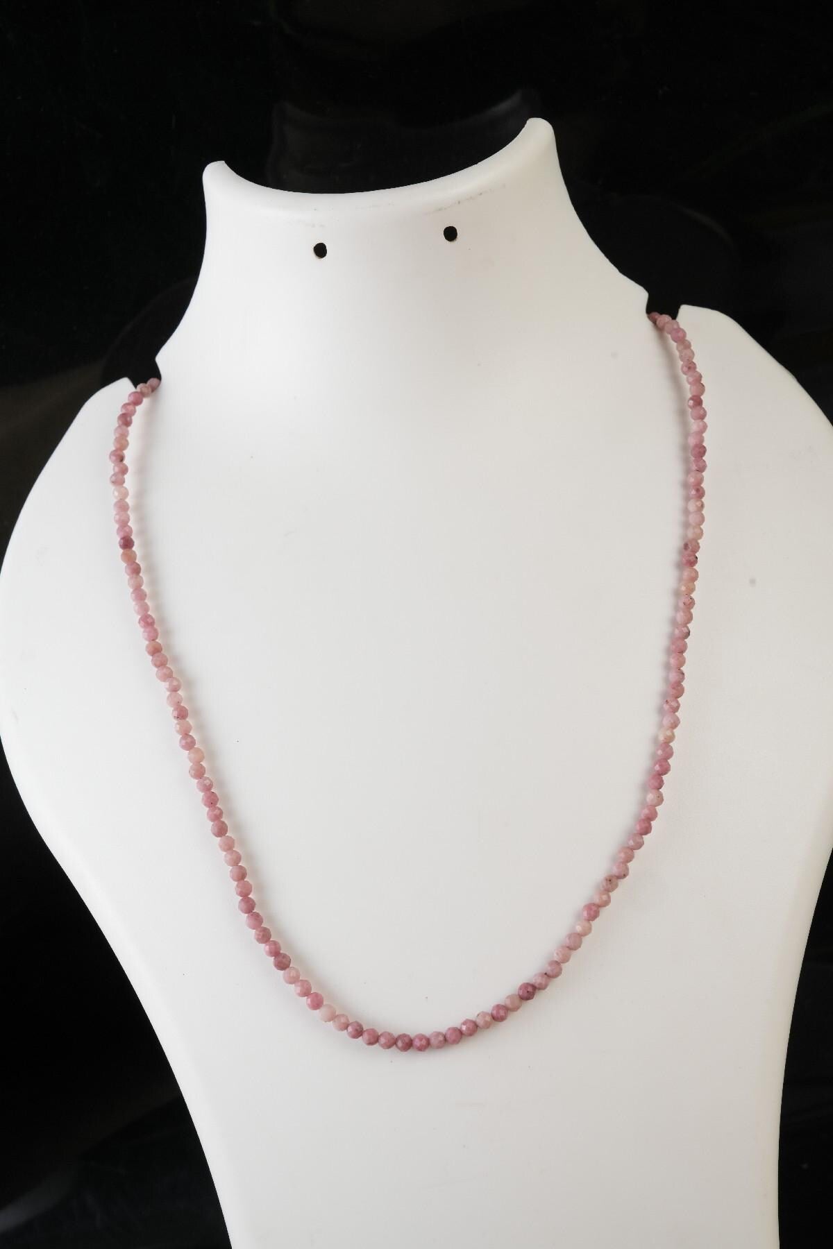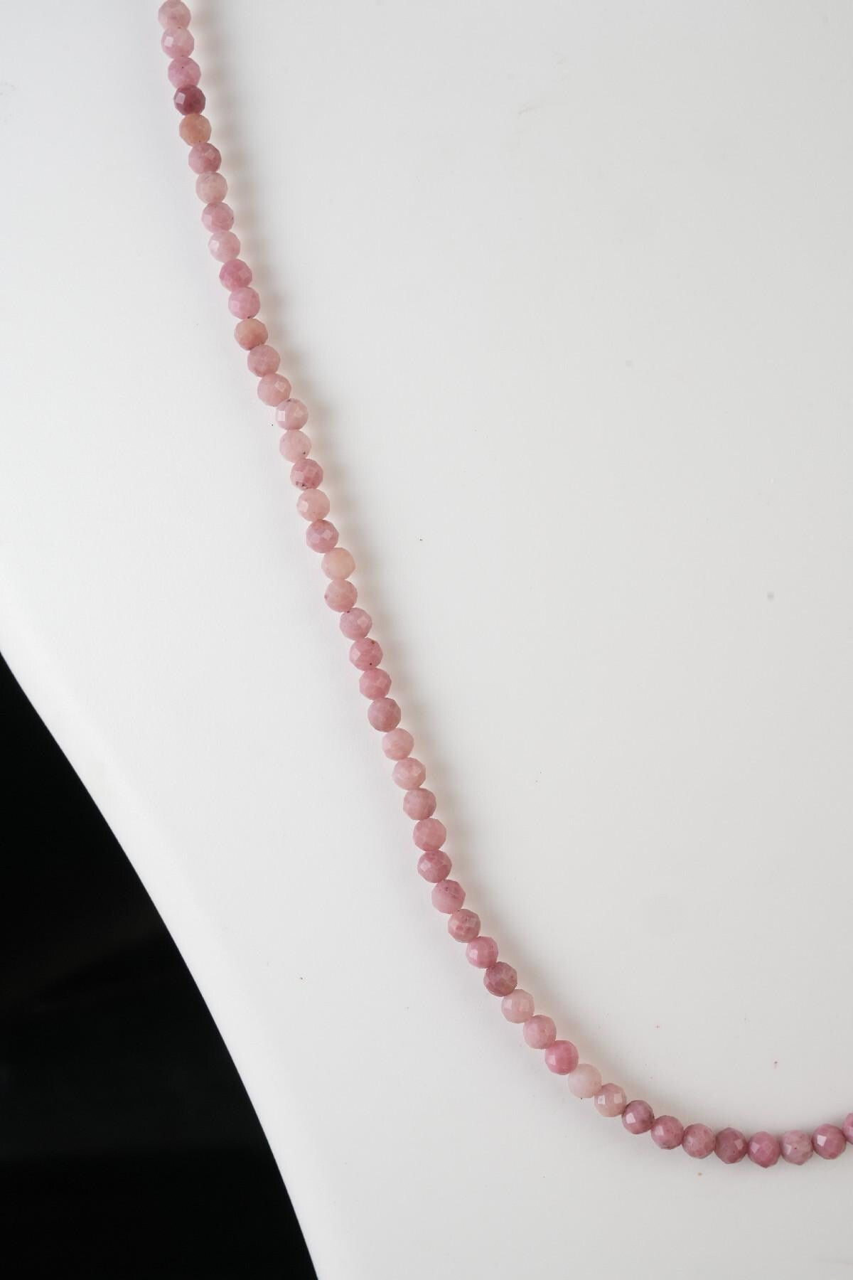 Necklace Length : 16.5 Inches + 2.5 Inches Adjustable Chain- **Premium Quality**: Crafted from genuine rhodonite, this necklace showcases the natural beauty of high-quality gemstones, ensuring durability and a luxurious feel that lasts.- **Healing Properties**: Known for its emotional healing benefits, rhodonite helps to balance emotions and promote self-love. Wear this necklace as a daily reminder of your strength and resilience.- **Handcrafted Artistry**: Each bead is meticulously handcrafted into 3 MM round micro-faceted shapes, creating a stunning play of light that enhances your style while showcasing artisanal craftsmanship.- **Adjustable Comfort**: Designed with versatility in mind, the adjustable feature allows you to customize the length for any occasion—whether layered with other pieces or worn solo for an elegant statement.- **Unique Aesthetic Appeal**: The rich pink hues interspersed with black veining create a one-of-a-kind look that complements any outfit. Stand out effortlessly at gatherings or during everyday wear!- **Thoughtful Gift Choice**: Perfect for birthdays, anniversaries, or just because! This mala necklace serves as a heartfelt gift that embodies love and positive energy—ideal for friends and family seeking inspiration.Elevate your jewelry collection with this exquisite Genuine Rhodonite Beads Necklace—where elegance meets emotional wellness!