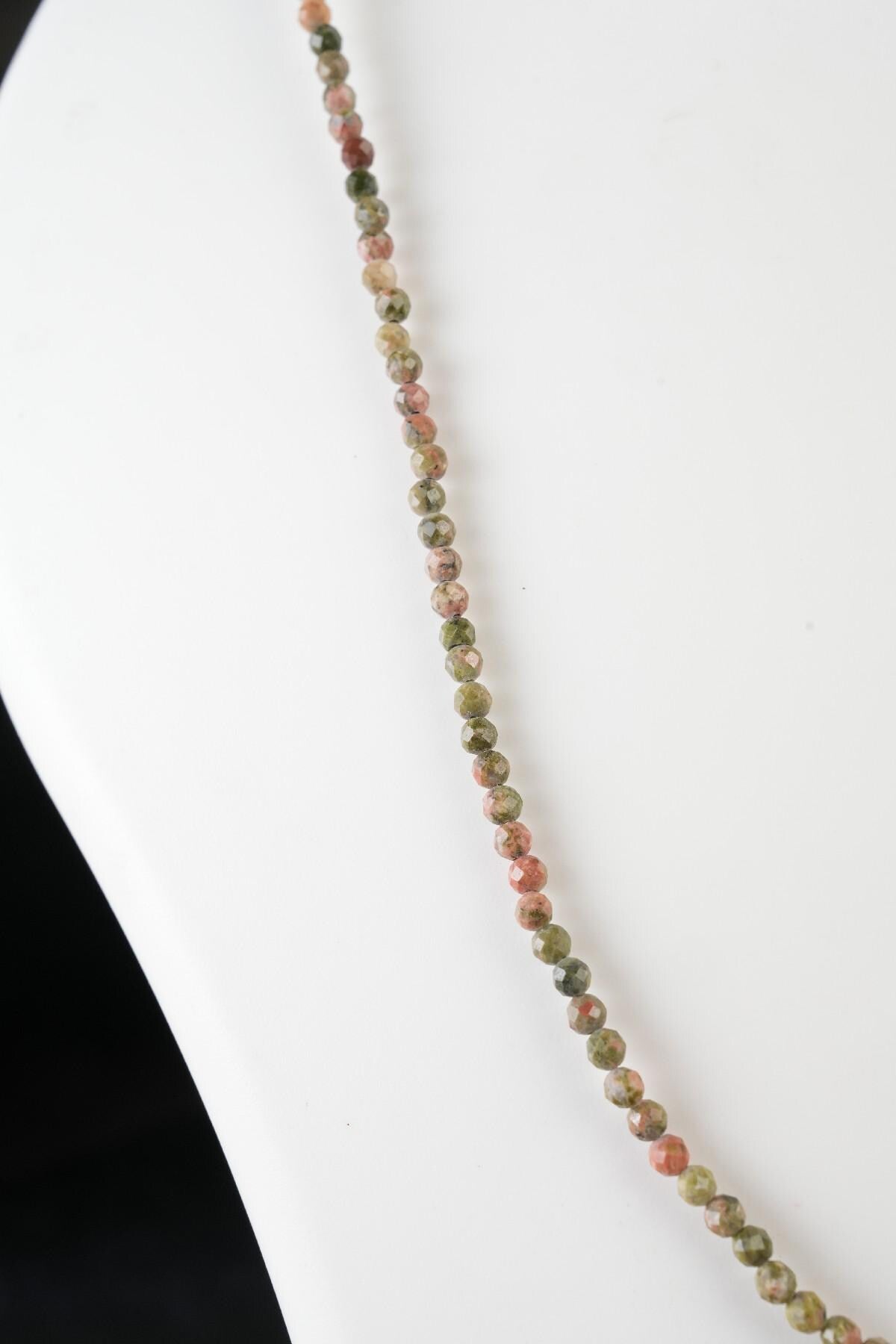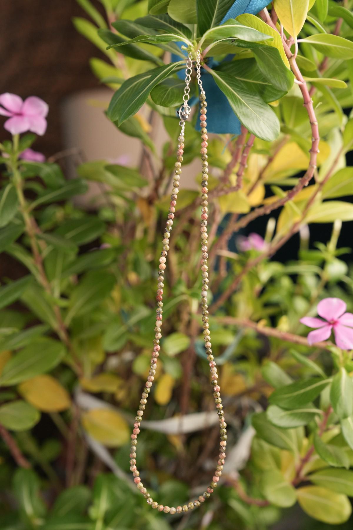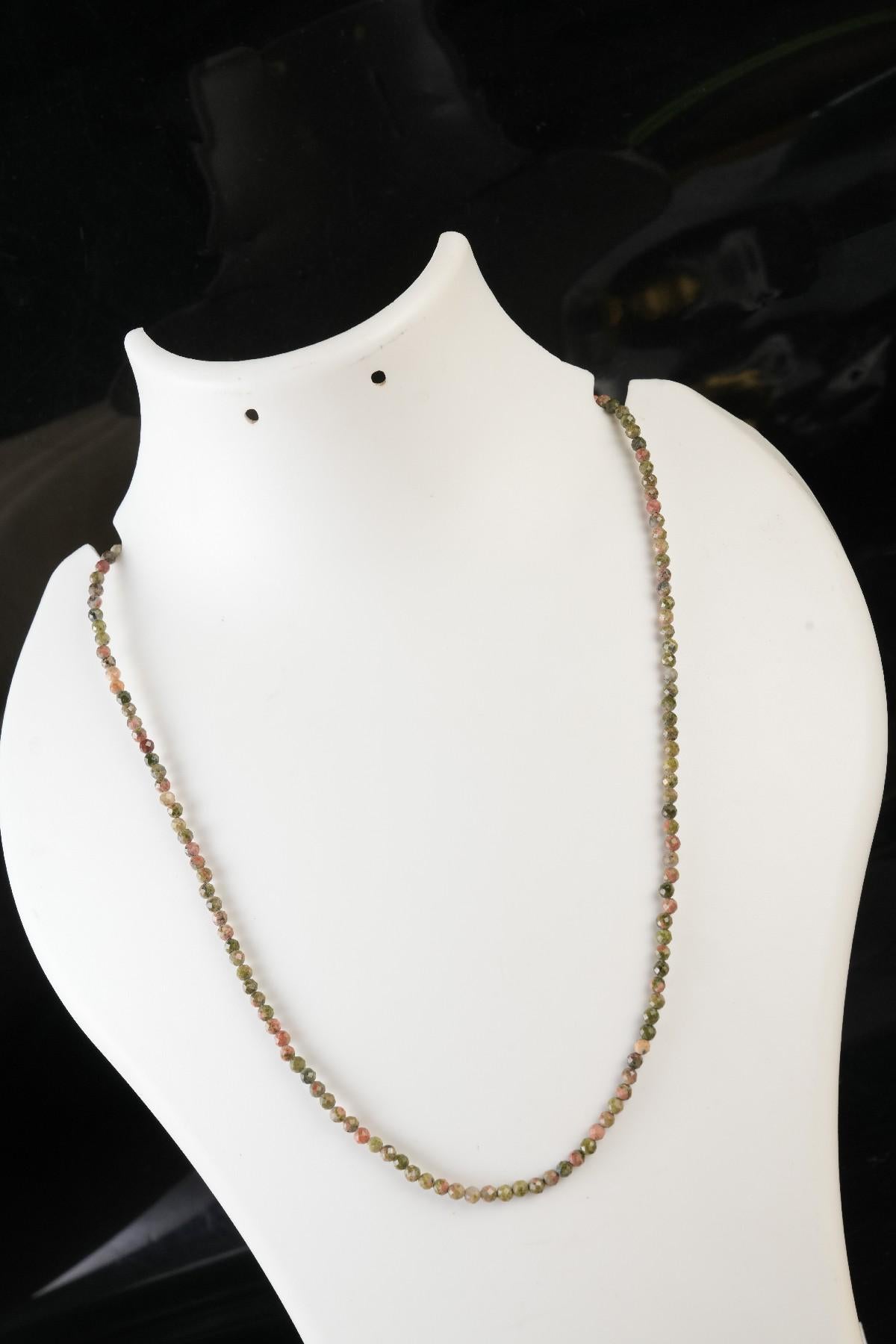 Necklace Length : 16.5 Inches + 2.5 Inches Adjustable Chain- **Premium Quality:** Crafted from genuine Unakite beads, this necklace promises exceptional quality and durability. Each bead is meticulously selected to ensure a luxurious feel that lasts.- **Spiritual Connection:** Embrace the healing properties of Unakite! Known for promoting emotional balance and grounding energy, wearing this mala necklace can enhance your meditation practice and bring peace to your daily life.- **Adjustable Design:** Featuring an adjustable length, this handcrafted mala necklace offers versatility in styling. Whether you prefer a snug fit or a longer drape, it easily adapts to suit any outfit or occasion.- **Artisan Craftsmanship:** Each 3 MM round micro-faceted bead is carefully hand-strung by skilled artisans, ensuring that no two necklaces are alike. The intricate faceting catches the light beautifully, adding an elegant shimmer to your look.- **Unique Style Statement:** This necklace isn't just jewelry; it's a conversation starter! Its unique blend of earthy tones makes it perfect for layering with other pieces or wearing solo as a standout accessory. Elevate your style while embracing nature’s beauty!Transform your everyday wear with the Genuine Unakite Beads Necklace—where elegance meets spirituality. Perfect for gifting or treating yourself!