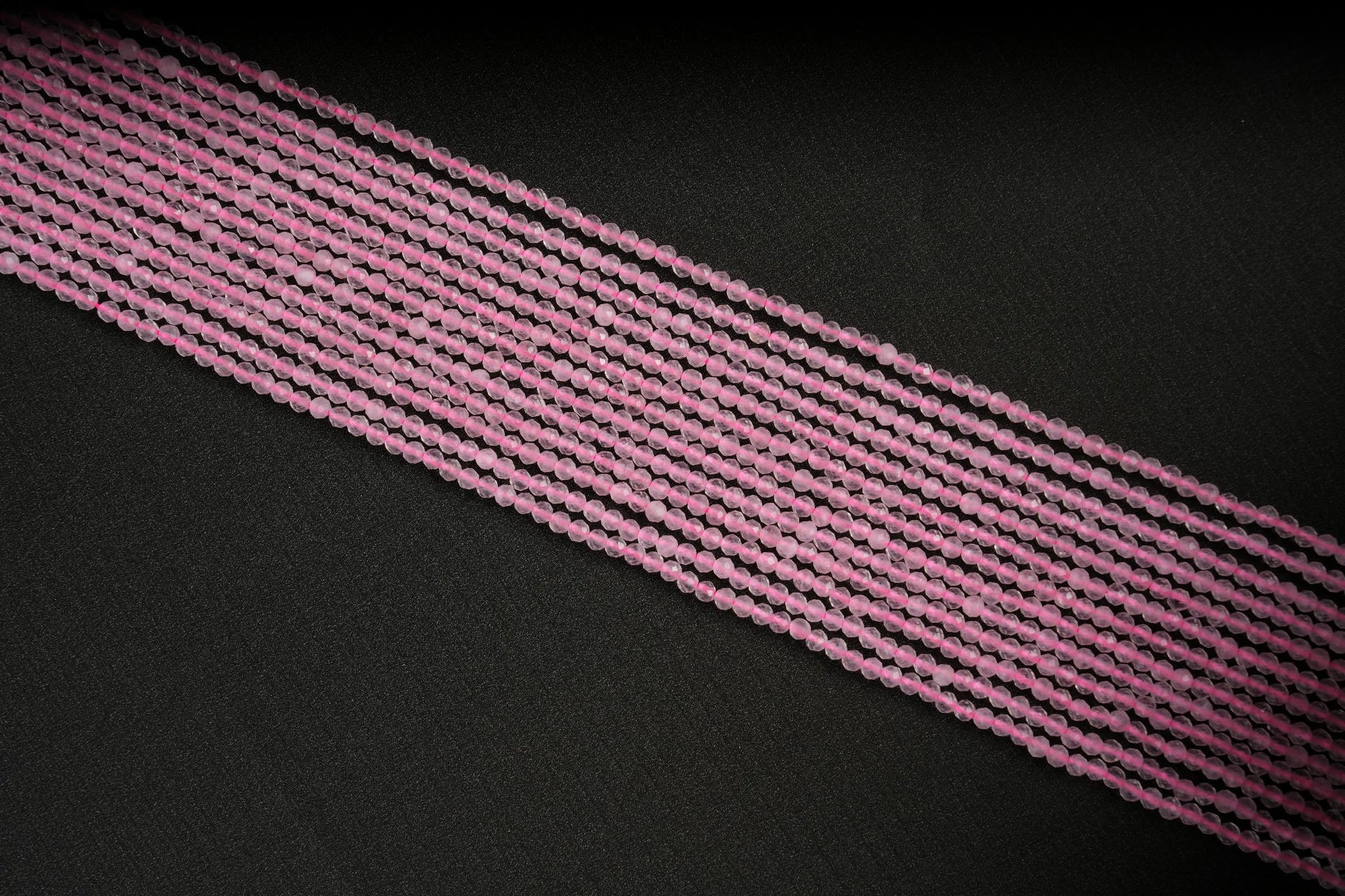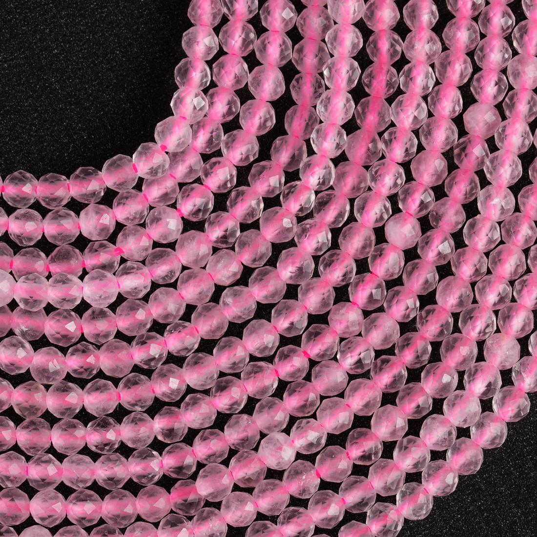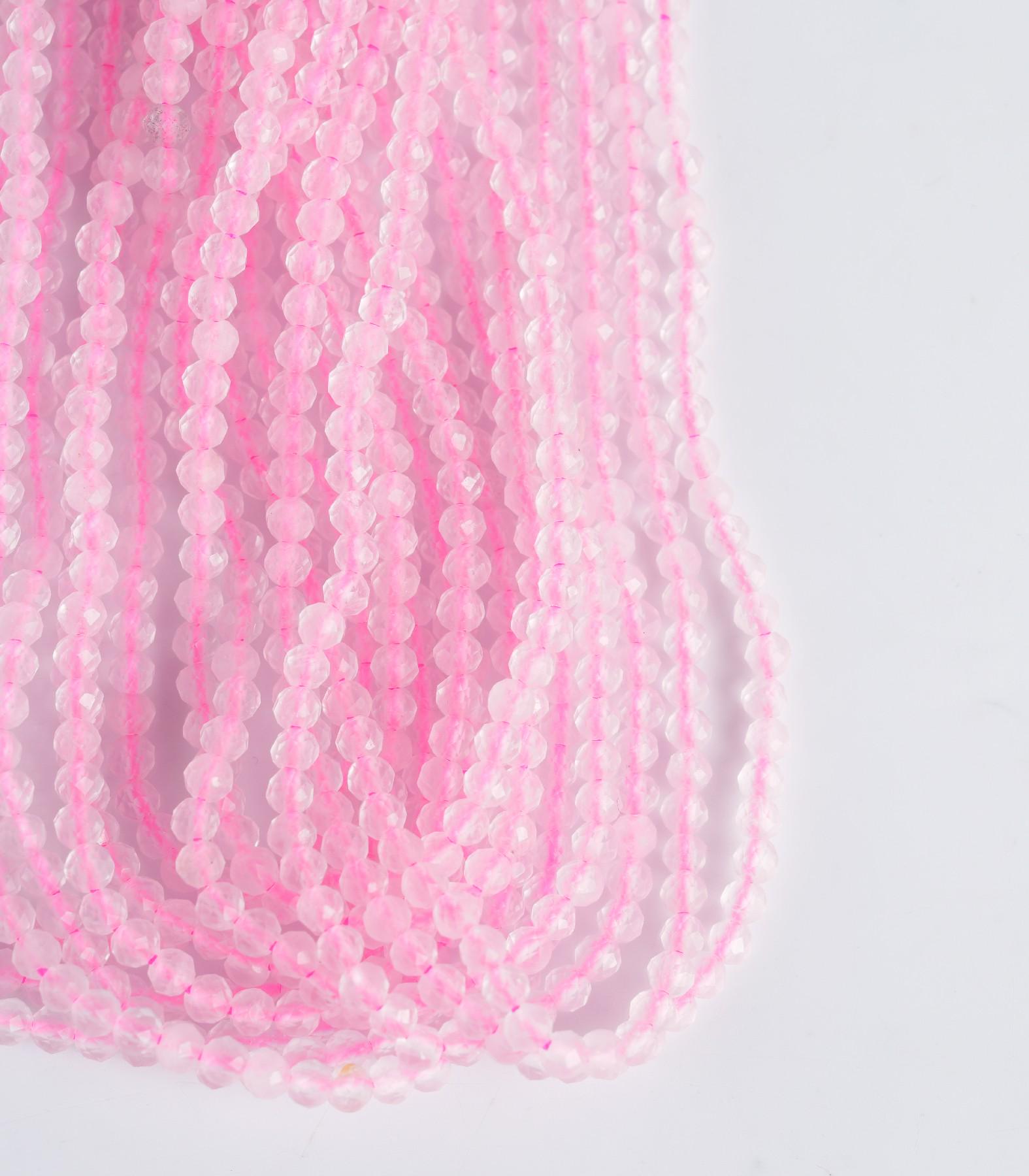 String Length : 15.5 Inches Each- **Premium Quality**: Crafted from genuine natural rose quartz, these micro faceted beads offer exceptional durability and a stunning finish that will elevate any jewelry piece.- **Versatile Sizes**: Available in 2mm, 3mm, 4mm, and 6mm sizes, this string of beads allows you to mix and match for endless design possibilities. Perfect for creating delicate necklaces or bold statement pieces!- **Healing Properties**: Known as the stone of love and compassion, rose quartz is believed to promote emotional healing. Incorporate these beautiful beads into your creations to infuse them with positive energy and intention.- **Design Excellence**: Each bead features a unique micro-faceted surface that catches the light beautifully, adding a touch of elegance to your handmade jewelry. The soft pink hue complements any color palette effortlessly.- **Inspiration Awaits**: Whether you're an experienced jeweler or just starting out in crafting, these rose quartz beads inspire creativity and help you express your individuality through unique designs. Transform your ideas into reality with ease!Elevate your crafting experience with our exquisite natural rose quartz gemstone beads—perfect for making heartfelt gifts or personal treasures!Number of beads per 15.5" strandWe sell our products by the strand, not by the number of beads. The following chart is for reference only. It's for traditional round-shaped beads strung continuously without spacer beads or knots in between.2mm in diameter- about 195pcs/strand 3mm in diameter- about 130pcs/strand 4mm in diameter- about 96pcs/strand 6mm in diameter- about 68pcs/strand Note: -Bead sizes are approximate and may have a variation of +/- 0.5mm. -Drill hole sizes are approximate and may have a variation of +/- 0.2mm. -All natural gemstones vary in color and pattern. We try our best to make our photos represent the real products in person.